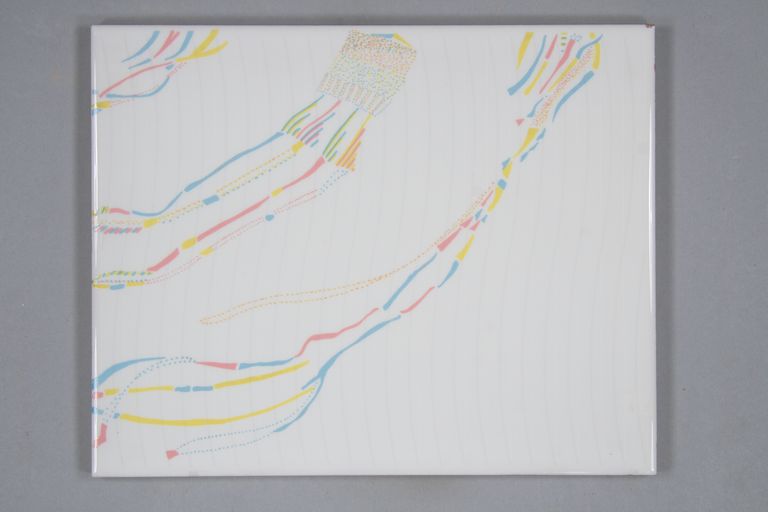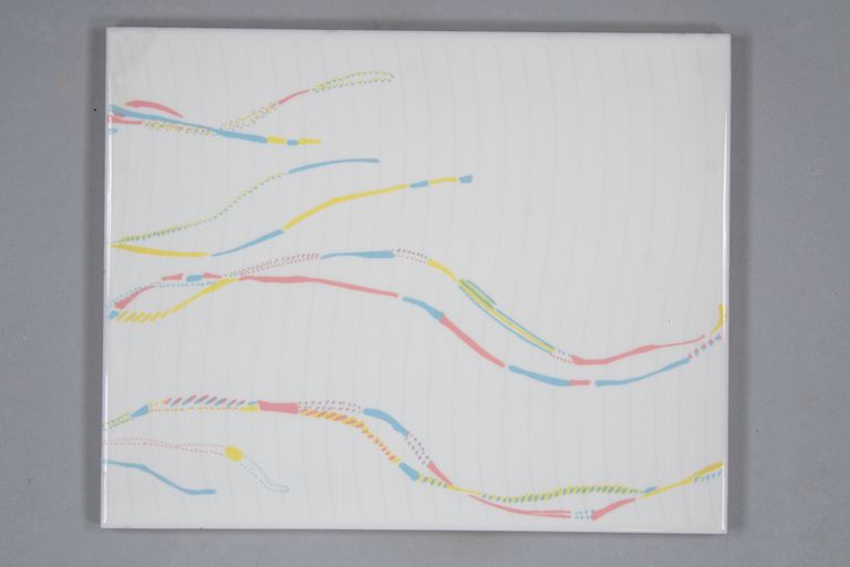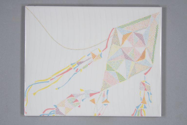 Piastrelle rivestite di smalto bianco lucido "porcellanato" che nella tinta unita si presenta con due serigrafie a gran fuoco, mentre i decori sono sempre serigrafici ma a terzo fuoco. Il disegno di fondo è composto da righe parallele bianche e righe ondulate grigie, mentre il disegno dell'aquilone è a 4 colori e si compone di 5 elementi. I colori utilizzati sono azzurro, giallo e rosa.