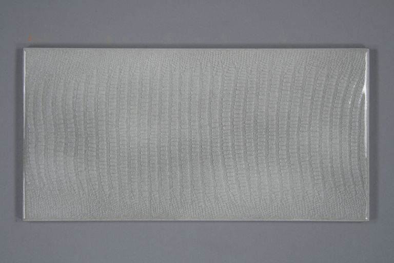 Piastrella della collezione "Pelle – Tejus Grigio", smaltata in grigio lucido fiammato e decorata serigraficamente con una texture chiara simile alla pelle di coccodrillo.