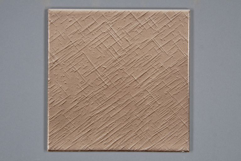 "Tela di sacco" piastrella rivestita con uno smalto di fondo bianco, texturizzata da goccioline di smalto applicate con discatura laterale, fiammatura e invetriatura finale. Colore marrone sfumato che riprende la texture di una tela di juta.