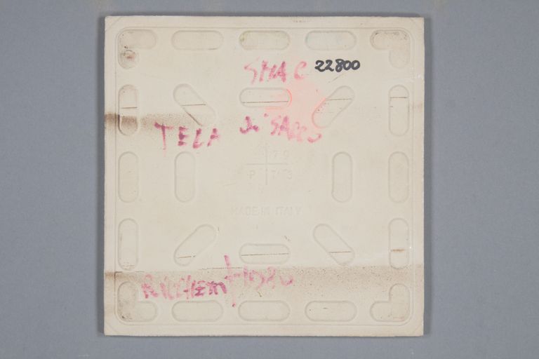 Nel retro al centro sono presenti caratteri alfanumerici e sotto "MADE IN ITALY". A pennarello rosa è presente la scritta "SMAC/ TELA DI SACCO/ RICCHETTI/ 1980".