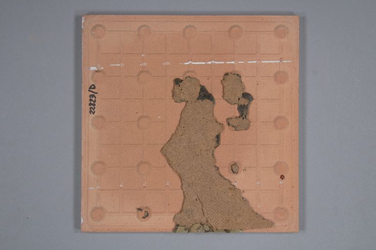 c: "Schira Bruno" piastrella decorata con fasce marroni lungo i bordi, centralmente un quadrato è lasciato bianco e ne è tracciata la cornice in verde;