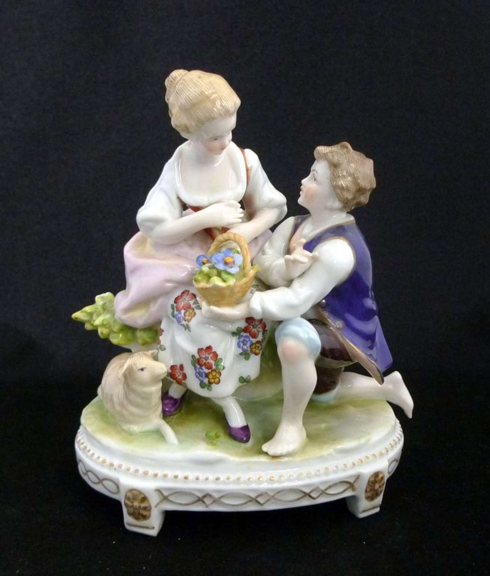 Gruppo policromo che rappresenta due giovani pastorelli in atteggiamento galante: la damina seduta e il damerino inginocchiato nell'atto di porgerle un cestino di fiori; pecorina accosciata, il tutto su base ovale. Dipinto in policromia con finiture in oro.