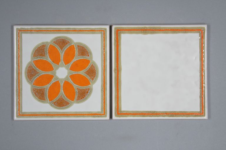 Piastrelle della serie "MT3" decorate con tre serigrafie sopra smalto bianco, originariamente montate su pannello di legno.