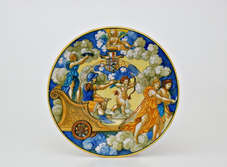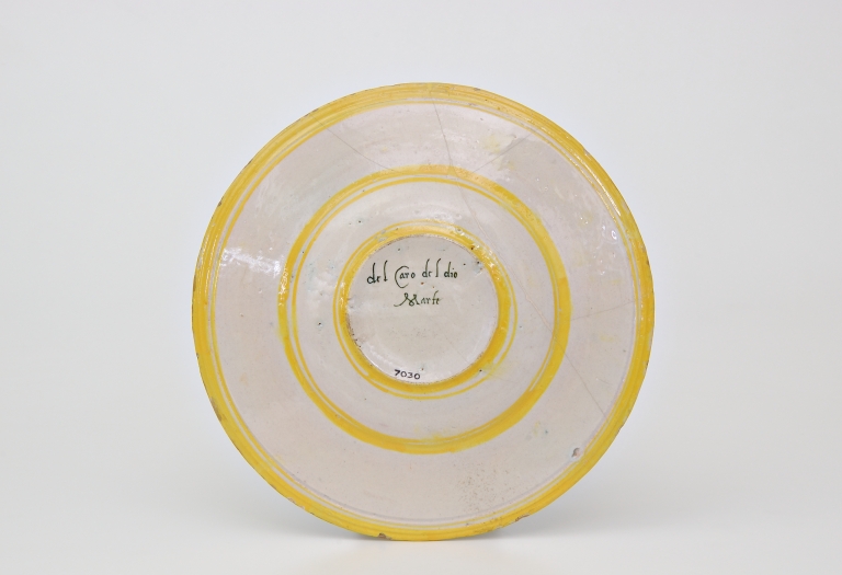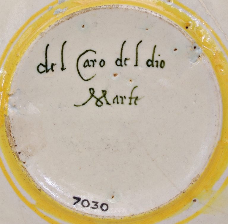Piatto con basso cavetto e larga tesa poggiante su piede anulare. Al recto vi è raffigurato "Il carro di Marte": Marte seduto sul carro celeste è trainato sulle nubi da due figure femminili mentre una terza si appresta a cingergli il capo con una corona d'alloro. Al centro, sospeso sulle nubi, Cupido nell'atto di scoccare una freccia e, sopra, un altro putto alato sorregge la corona ducale posta sullo stemma Gonzaga-Paleologo. Sul verso filetti gialli concentrici e nel centro iscrizione in bistro "del Caro del dio/ Marte". Dipinto in arancio, blu, bruno, giallo, nero e verde.