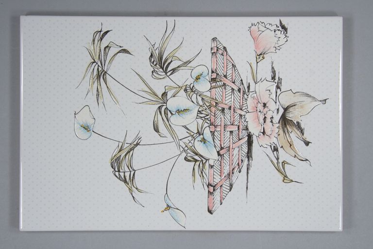 Piastrella dallo smalto di fondo bianco lucido con texture serigrafica a pois grigi. Decorazione a terzo fuoco con pennellate a mano su traccia serigrafica nera. Il disegno rappresenta una composizione di fiori, i colori utilizzati sono azzurro, rosa e verde.
