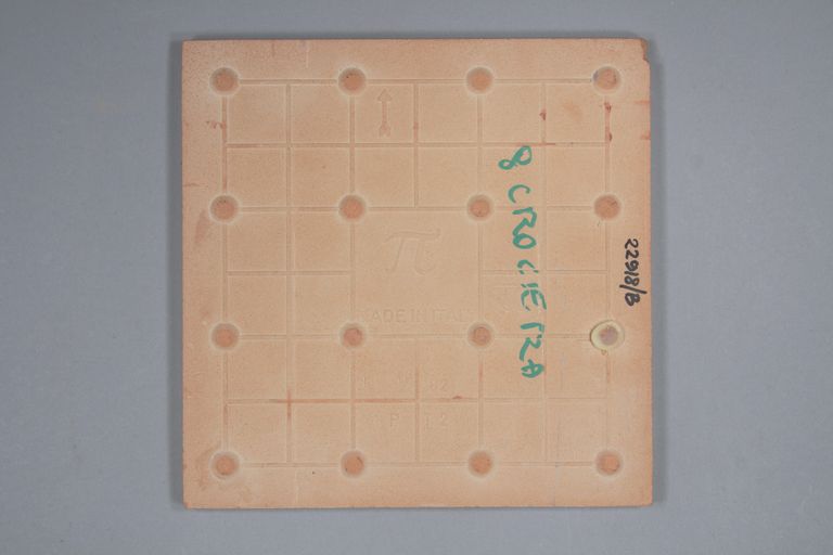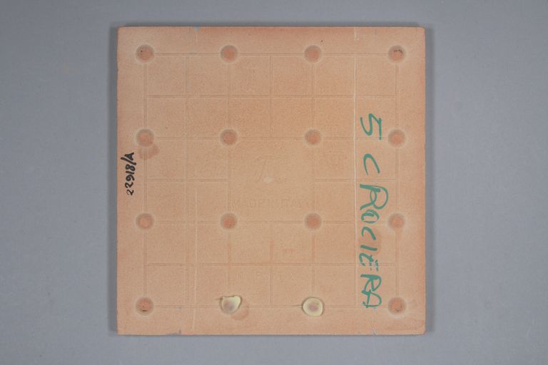 Nel retro, al centro, è impresso il simbolo dell'azienda "Cotto Petrus" (un pi greco) a fianco la sigla "TT", in alto il simbolo di una freccia e in basso caratteri alfanumerici. E' presente una scritta a pennarello verde.