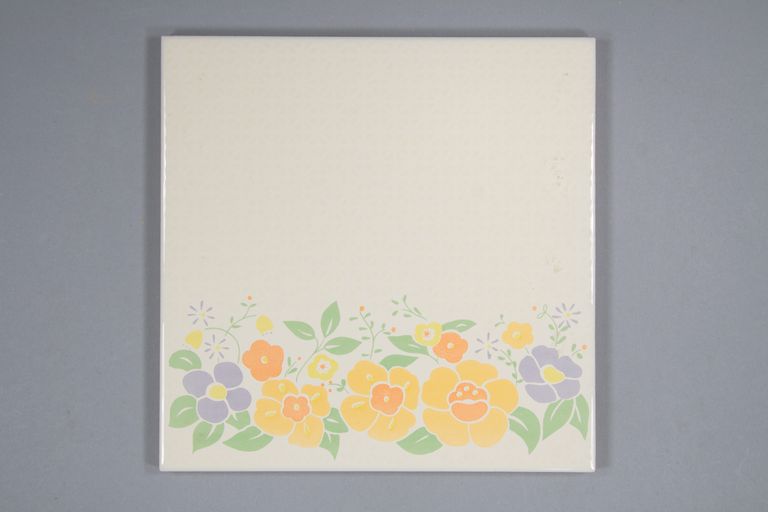 a: "Cipro 1" 1 piastrella decorata con una fascia posta in prossimità del bordo e con disegni di fiori e foglie;