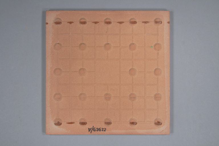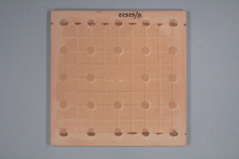 Piastrelle della serie "Cipro" decorate con 6 serigrafie sopra smalto bianco panna con decorazione in bassorilievo eseguito con serigrafia reagente affondante di elementi triangolare accostati. I colori utilizzati sono arancio, giallo, lilla, ocra e verde.