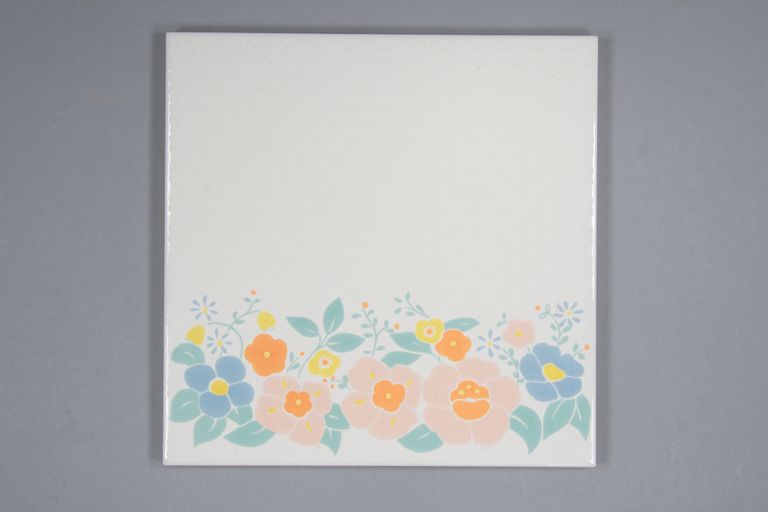 a: "Rodi 1" 1 piastrella decorata con una fascia di fiori e foglie posta in prossimità del bordo;
