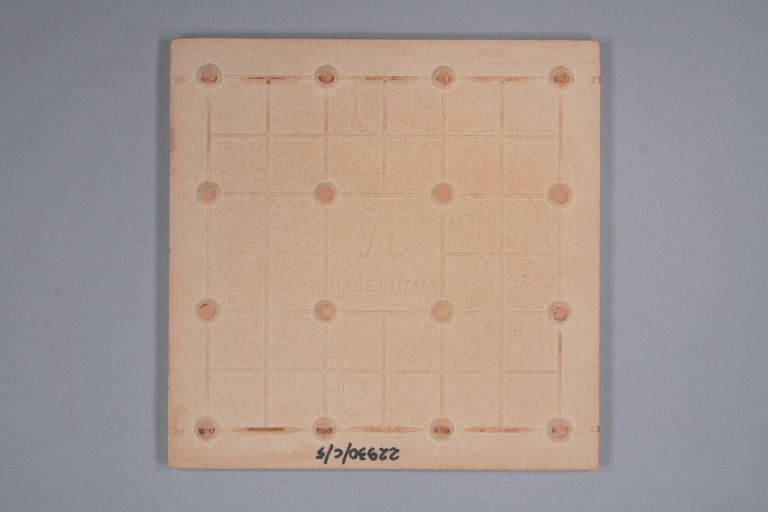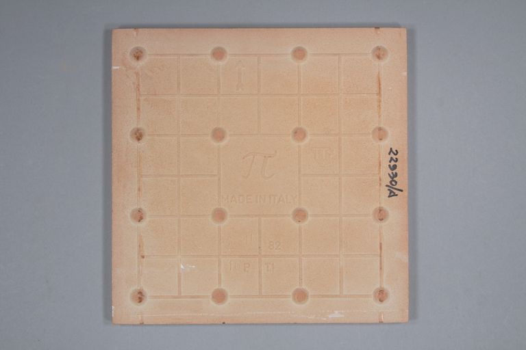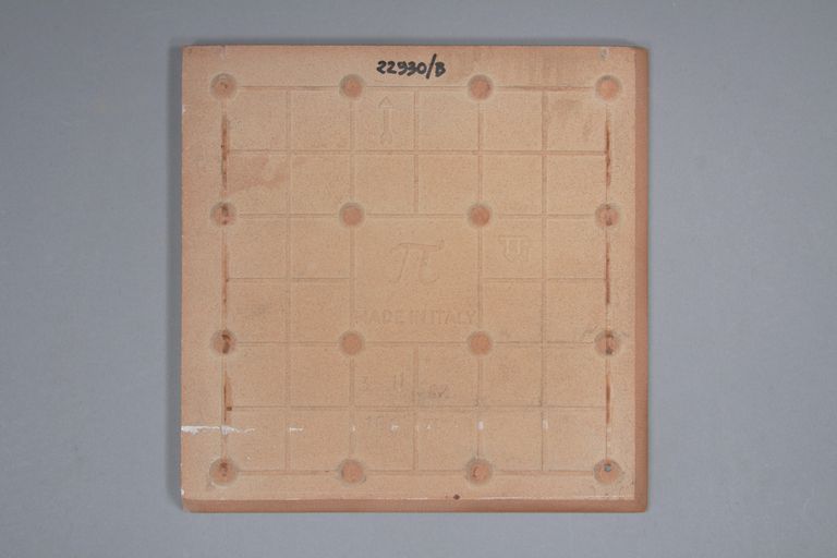 Nel retro, al centro, è impresso il simbolo dell'azienda "Cotto Petrus" (un pi greco) a fianco la sigla "TT", in alto il simbolo di una freccia e in basso caratteri alfanumerici. Una piastrella non presenta il simbolo dell'azienda e la sigla "TT".