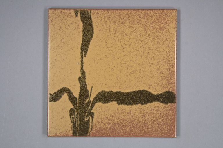Piastrella decorata con una serigrafia sotto smalto giallo/marrone, con lingue di colore verde.