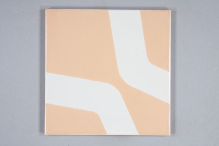 Piastrella decorata con campiture piene in colore rosa antico sopra smalto bianco matt.