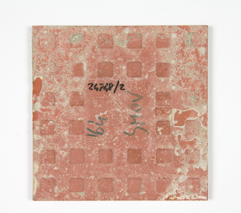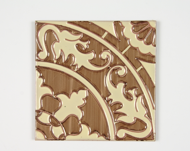 Piastrelle dal disegno modulare con una linea di contorno in rilievo che fa da diga di contenimento per gli smalti beige e marrone, decorazione con motivo fitomorfo.