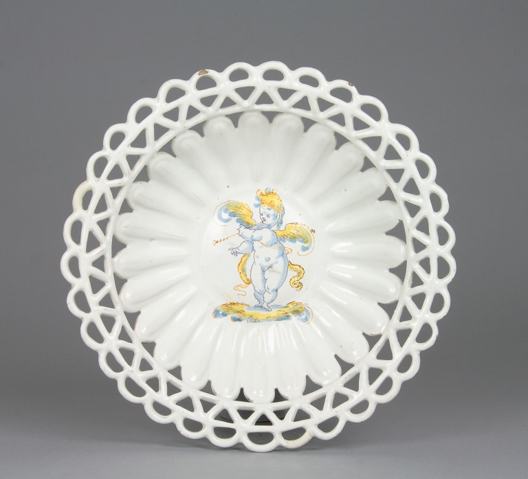 Coppa umbonata con parete baccellata, orlo estroflesso, traforato e sagomato, alto piede svasato e modanato. Sul recto, al centro, campeggia la figura di un putto alato in atto di suonare una chiarina.