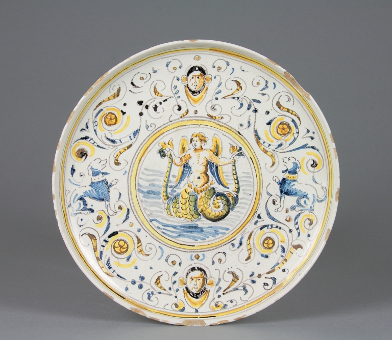 Vassoio a fondo piano, breve orlo rialzato, alto piede svasato. Sul recto, medaglione centrale con sirena bicaudata e alata; sulla restante superficie, decorazione "a raffaellesche" con coppia di cani e coppia di testine dal collo velato, disposte si schema cruciforme e contornate da girali fogliate e da minuti motivi vegetali.
