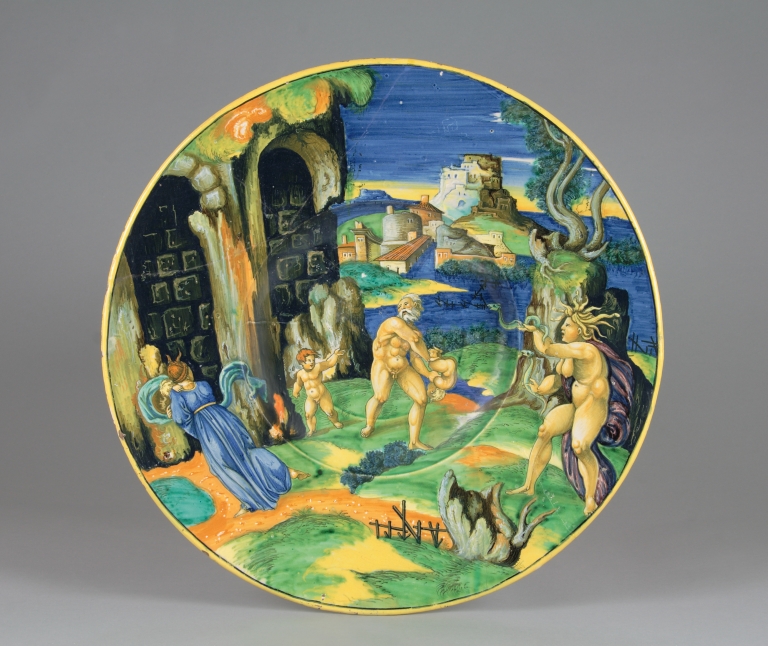 Grande piatto a basso cavetto ed ampia tesa obliqua e accenno di piede ad anello. Sul recto a piena superficie, è raffigurata la storia di "Ino e Atamante" su sfondo a paesaggio con rocce ed arcate alla sinistra. Sul verso la legenda "De Atama(n)te et ino i(n)furiati/ Fabulay" in turchino. Dipinto in arancio, blu, bruno, giallo, nero, verde e viola.