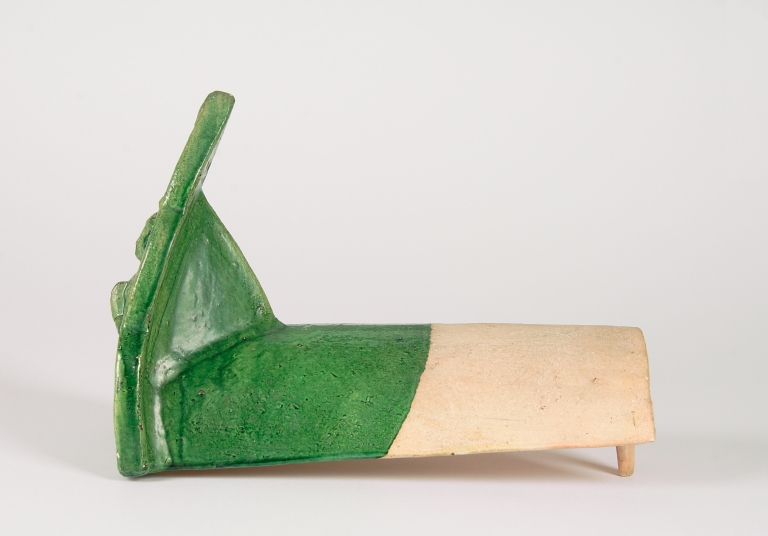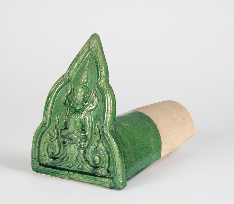Tegola terminale di gronda semicilindrica, con vetrina verde, con “antefissa” a finestra trilobata inscrivente un personaggio inginocchiato, a mani giunte e abbigliato in costume di corte. Questo personaggio, nascosto dalla vita in giù da una sorta di bocciolo fiancheggiato da due ricche girali (o nastri), è riconoscibile come un thepanom con le mani giunte nell’atto della tradizionale espressione di saluto rispettoso (wei).
