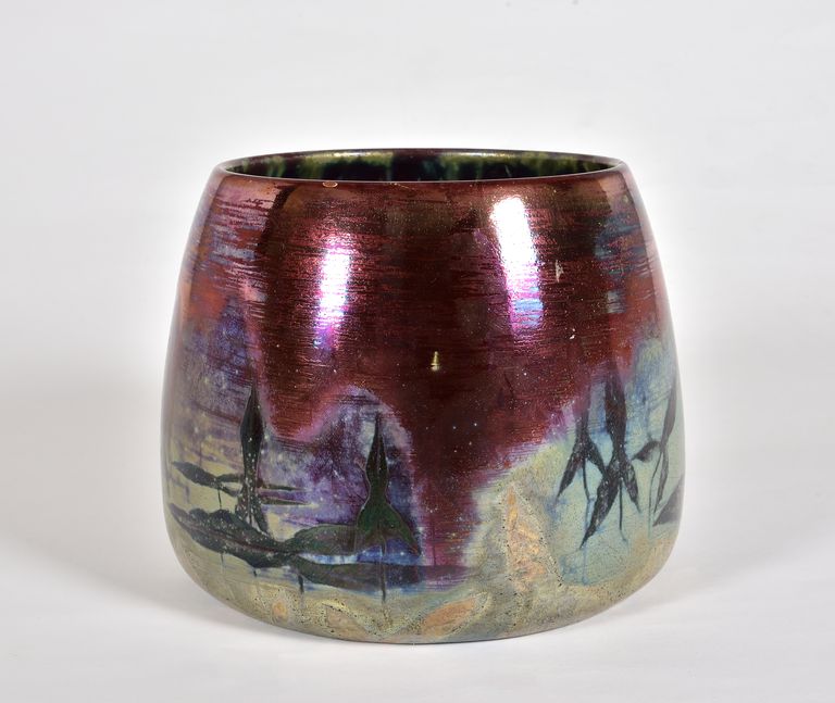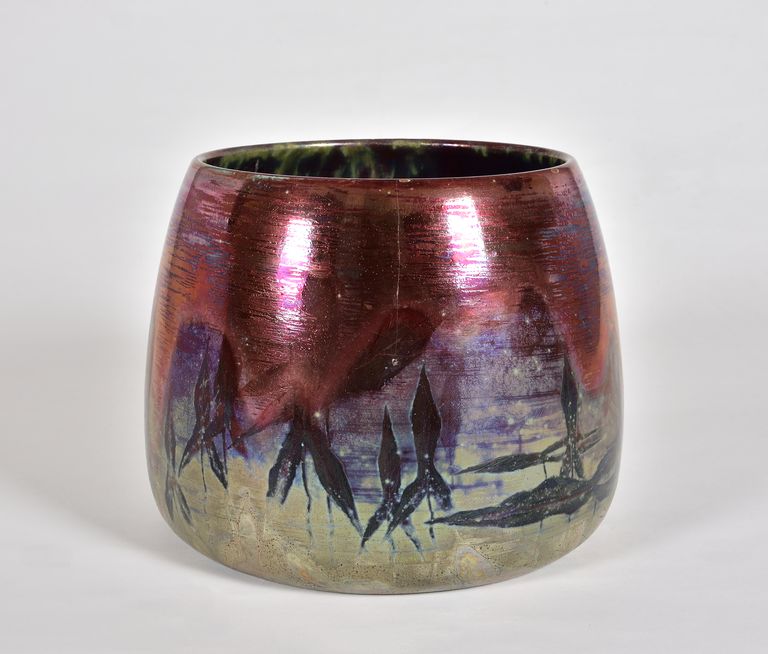 Cache-pot a corpo troncoconico. Decorato con foglie lanceolate con smalti a lustro in rosso, blu e bruno esternamente; bruno con colature verdi all'interno. Firmato nel piede: CLEMENT MASSIER Golfe Juan L. IEVV.