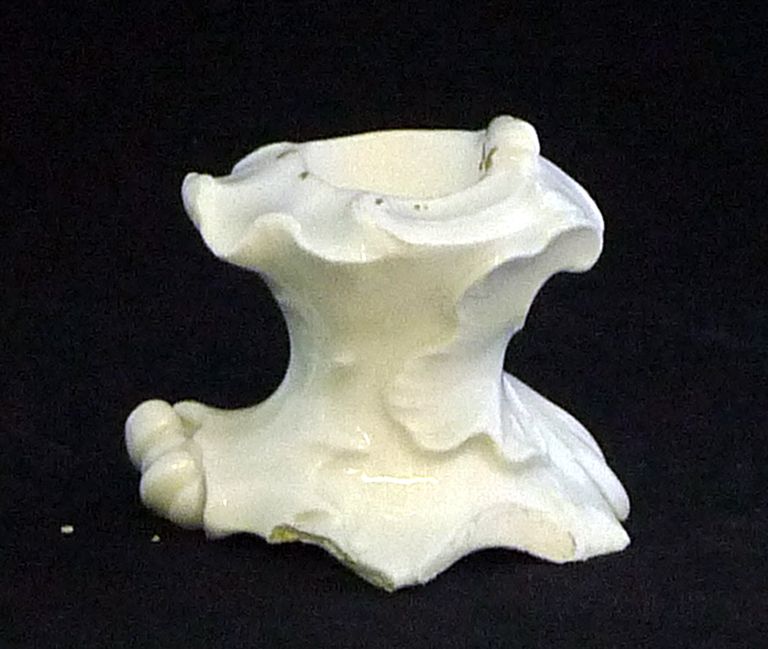 Portacandele in porcellana bianca con motivi a rocaille, forse parte di un centrotavola.