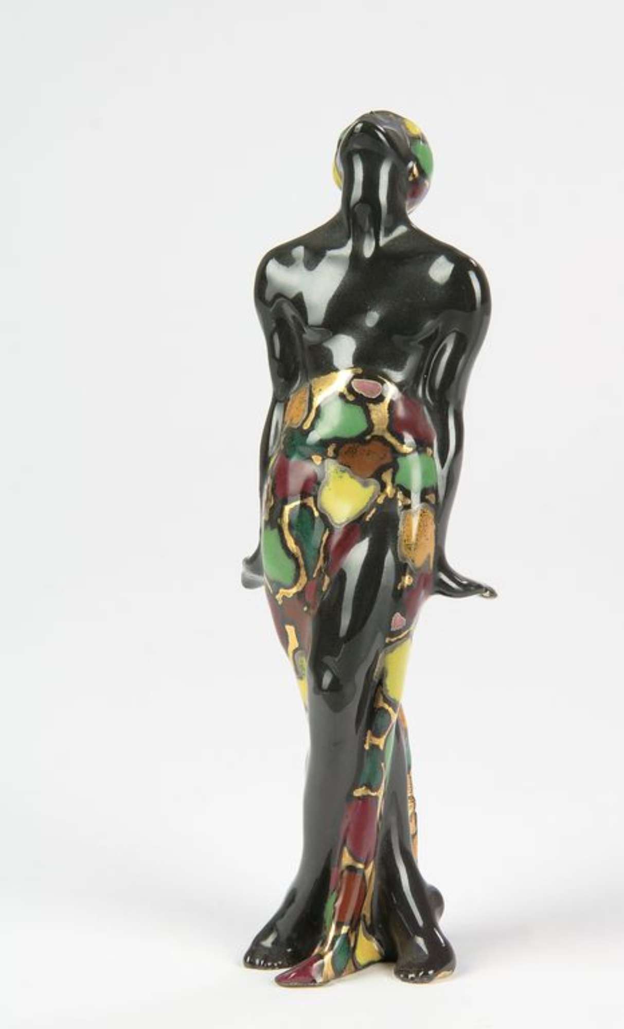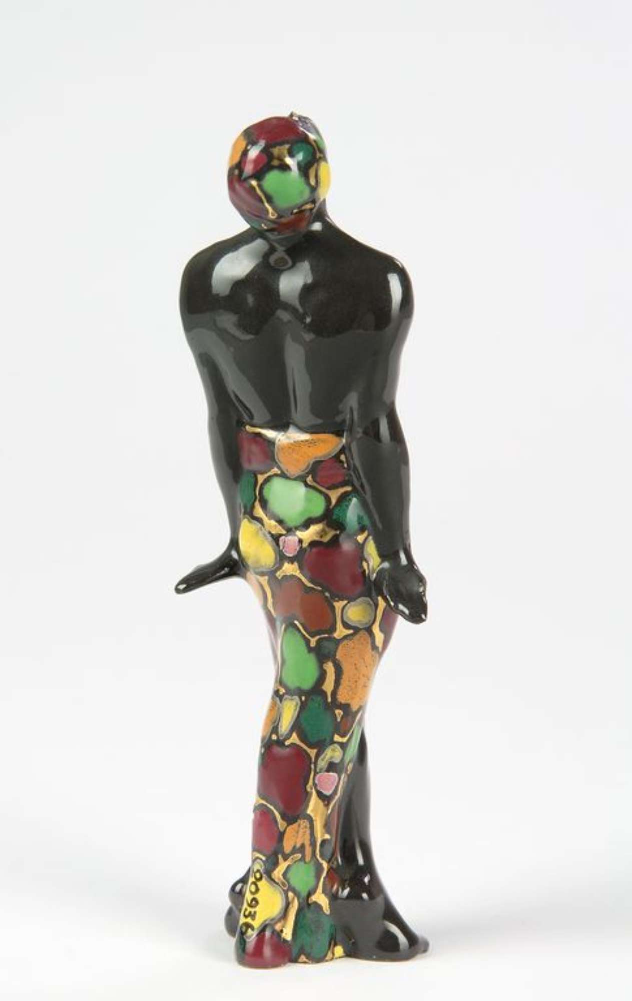 Smalto nero, costume a macchie rosse, gialle, verdi, arancio, rosa, a contorno argento su fondo oro. Firmato e datato sul fondo.
