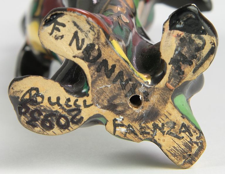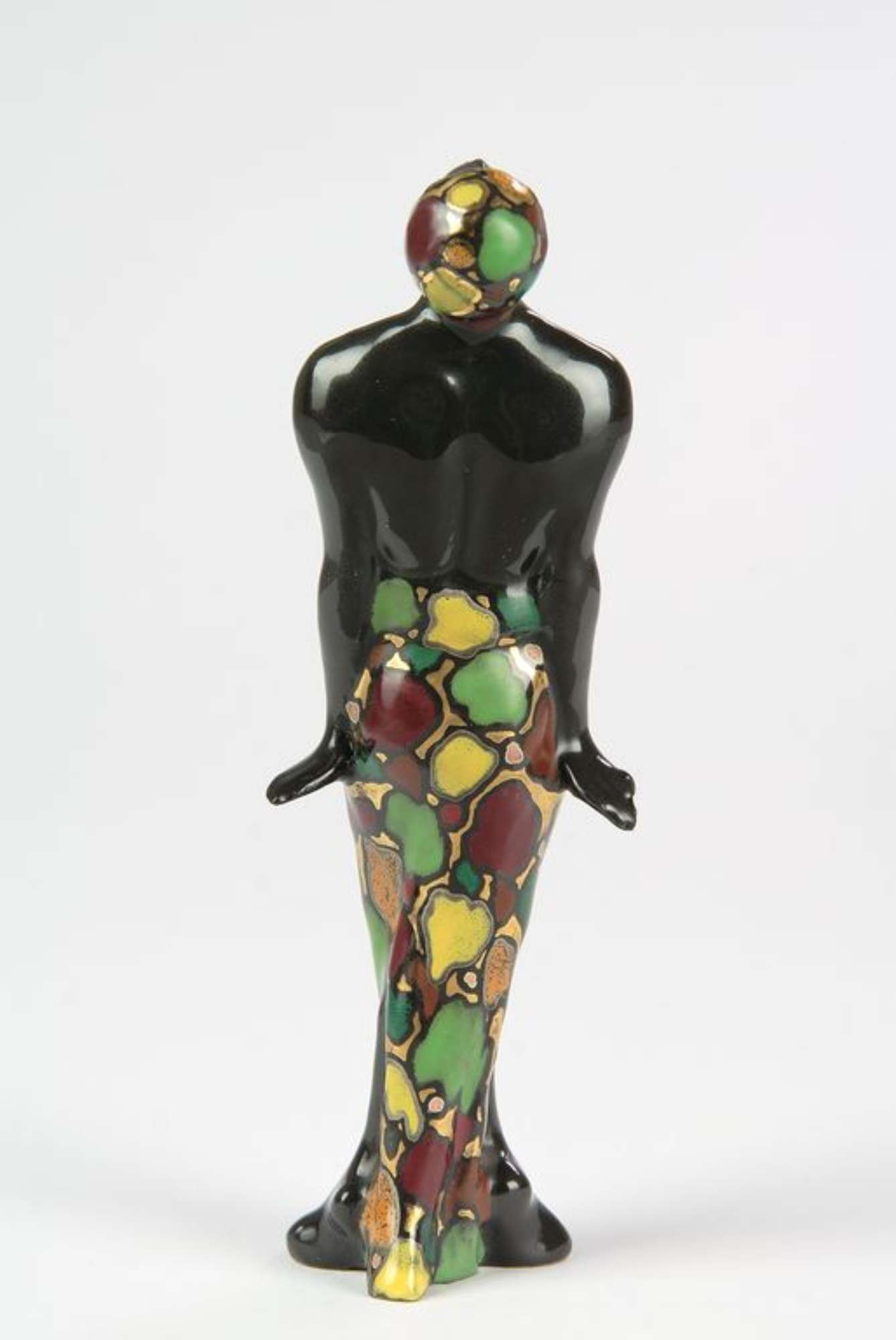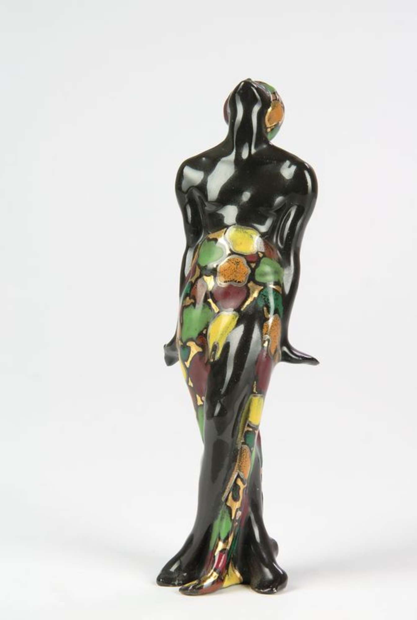 Smalto nero, costume a macchie rosse, gialle, arancio, verdi a contorno argento su fondo oro. Firmato sul fondo.