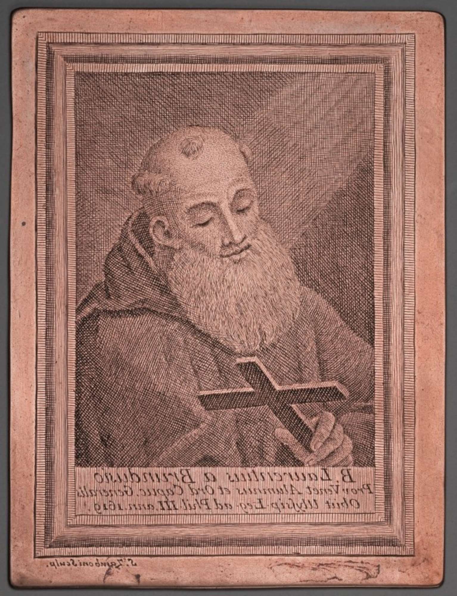 La matrice di rame, incisa a bulino, raffigura S. Lorenzo da Brindisi nell'atto di stringere tra le mani un crocifisso.