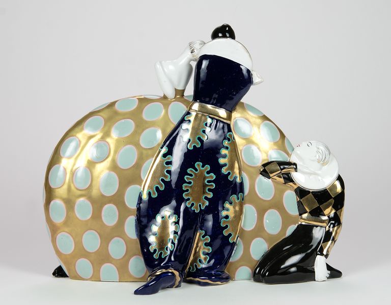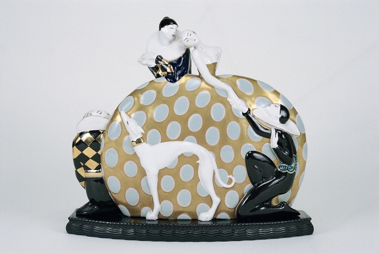 Damina dalla larga veste a campana dorata con pois celesti, circondata da tre pierrots uno dei quali è inginocchiato ai suoi piedi, l'altro è accosciato tra il fianco destro e il retro, il terzo è in posizione eretta alle spalle della damina. Sul davanti, in rilievo sulla gonna della damina, un levriero bianco con collare. Marcato alla base, in blu: "N° 1 / F. Nonni 1927 / A. Bucci", sagoma di vaso entro cerchietto con fiammelle / Faenza.