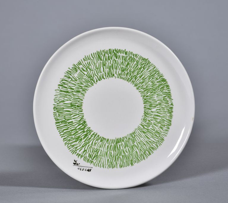 Impasto di colore biancastro, decorazione sopra vetrina a decalcomania, vetrina trasparente lucida. Decorato al recto, da cinque fasce concentriche a trattini. Decalcomania verde. All'esterno delle fasce in nero la firma Parisi Ico. Sul fondo, in arancio, "edizione/ studio marconi/ e/ studio la ruota/ 1982/ zanolli-nove".