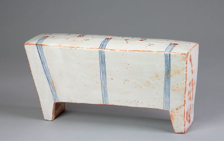 Vaso-scultura di forma rettangolare, poggiante su due piedi laterali a sezione trapezoidale. L'opera presenta la superficie superiore leggermente convessa con cinque fori disposti in fila. Decorato da una serie di cinque sottili linee blu parallele che partono dai fori e scendono, in alternanza, sul piano frontale e su quello retrostante.