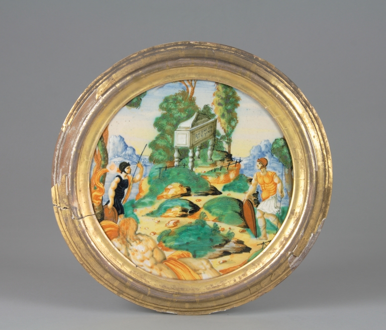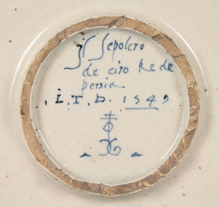 Frammento di centro di piatto con piede mutilo montato entro cornice in legno dorato. Sul recto è raffigurato su un poggio il sepolcro di Ciro, re di Persia, esplicitato anche dall' iscrizione "Qui giace ciro/ Re di Persia"; ai lati incedono verso il centro due guerrieri, mentre si scorge in primo piano una figura sdraiata vista di spalle, probabilmente personificazione fluviale; la scena si svolge in un paesaggio alberato con ammassi erbosi e montagne. Sul verso, entro il piede, la legenda "Il Sepolcro/ de ciro Re de/ persia/ I.T.D. 1549" accompagnata da un simbolo religioso con un globo sormontata da una croce patriarcale a doppia traversa (o di Lorena), poggiante sulle iniziali "CG" con la "C" rovesciata e intrecciata alla "G". Dipinto in blu, arancio, bruno, giallo, verde con lumeggiature.