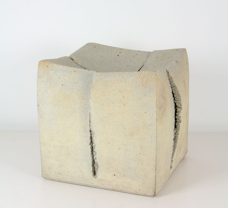 "Cubo" tagliato in croce da spaccature con la parte superiore depressa. Nella base, entro riquadro, la sigla Pm 72 in nero.