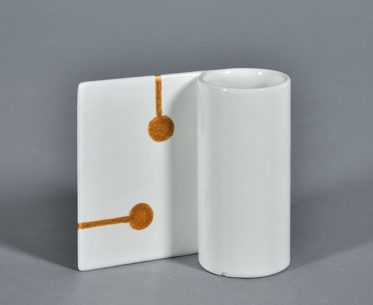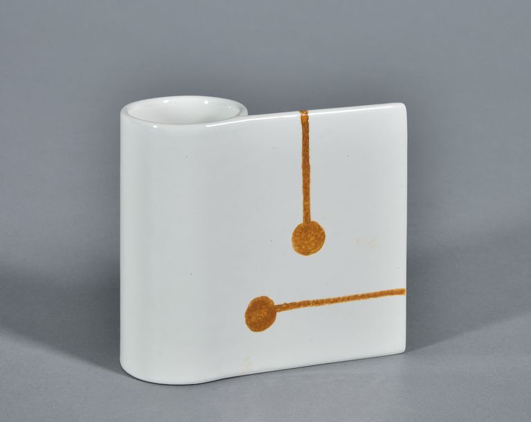 Di forma cilindrica, lateralmente è applicata una lastrina rettangolare. Unico apporto decorativo, in entrambi i lati, sono due strette fasce, una in verticale e una in orizzontale, che terminano in grossi punti circolari, realizzato in giallo ocraceo.