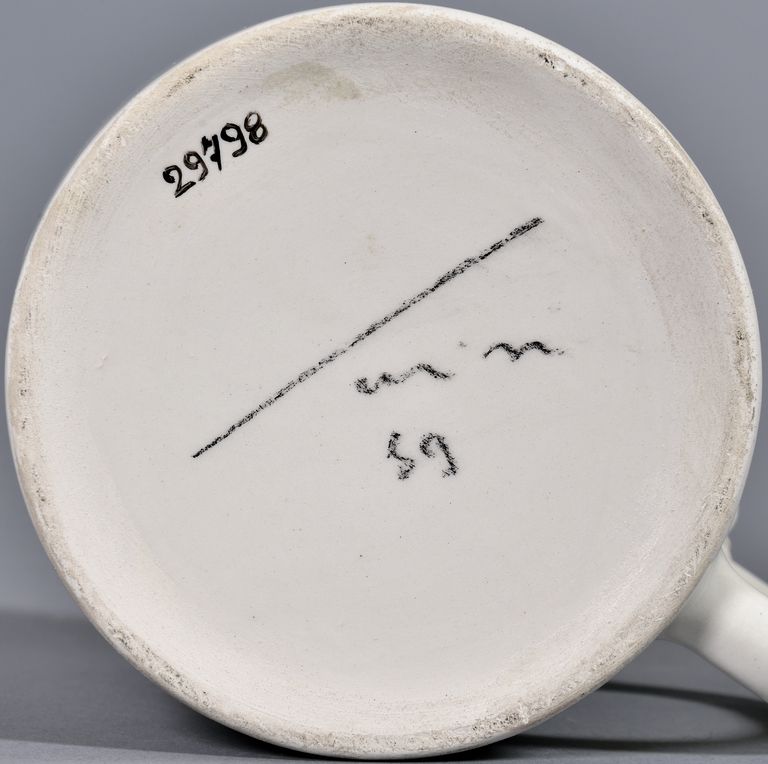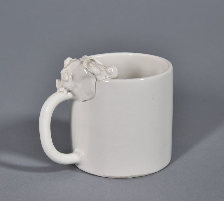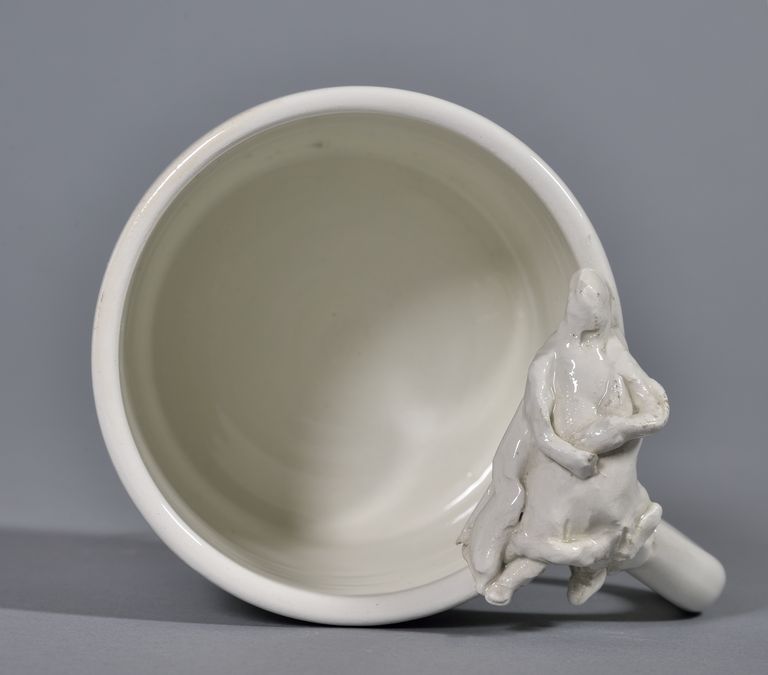 Di forma cilindrica con un'ansa laterale; sull'orlo della tazza, una figuretta antropomorfa con ampia veste distesa con un piede sull'orlo ed uno sull'ansa. Sul fondo della tazza la firma, in nero, "Parisi '89".
