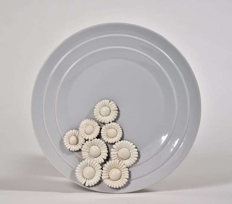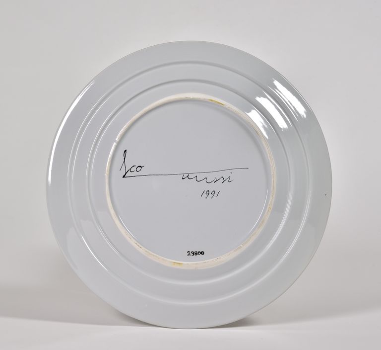 Di forma piana con bordo inclinato sagomato da tre scalini, ampio piede, smalto color grigiastro. Al recto, in un quarto della superficie, sono applicate otto margherite, di varie dimensioni, disposte a piramide dal centro verso l'esterno (terraglia leggermente invetriata). Sul fondo, in nero, la firma: "Ico Parisi 1991".