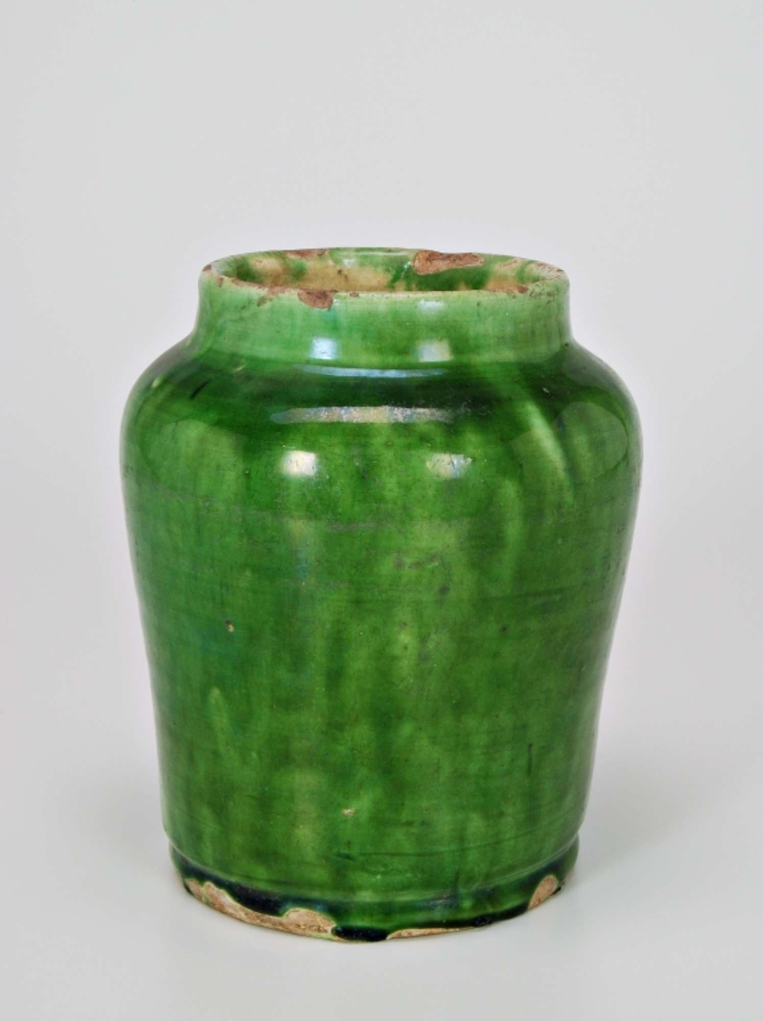 Corpo cilindrico rastremato verso il basso, larga base cercinata e breve colletto. Verniciato in verde.