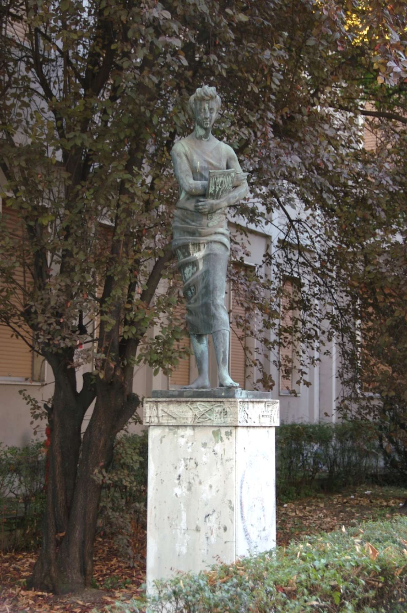 Si tratta di un’allegoria femminile della tecnica che tiene in mano un volume con scritto “Techne”. Il basamento marmoreo è decorato con i simboli della tecnica.