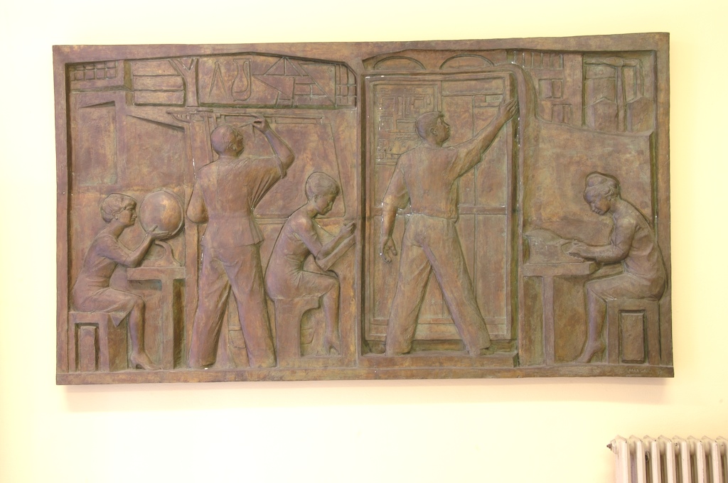 Bassorilievo che narra le attività dei servizi commerciali e turistici insegnati dalla scuola; è neorealista e realizzato con un naturalismo di stampo classicista e con fine esecuzione.
