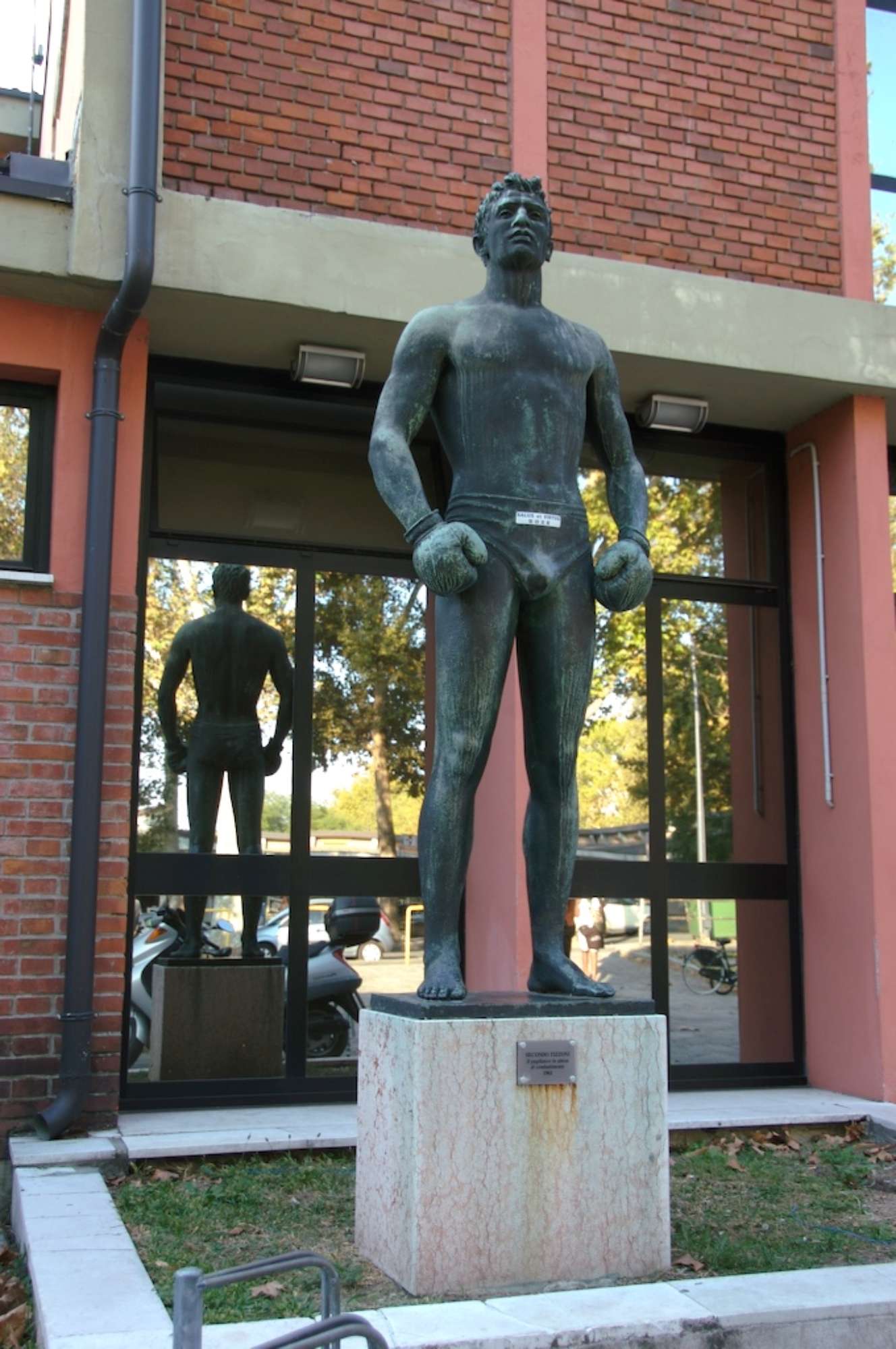 “Negli anni Sessanta, in coincidenza con l’incipiente boom economico, il Comune e la Provincia di Piacenza si propongono una politica di abbellimento della città con la realizzazione di opere da collocare all’aperto, in luoghi pubblici significativi del contesto urbano. Si comincia col Pugile in attesa di combattimento con cui Tizzoni vince nel 1961 il concorso indetto dal Comune di Piacenza per una scultura da collocarsi davanti al Palazzotto dello Sport. Si disse allora che l’opera di Tizzoni era troppo vicina a quelle di medesimo soggetto realizzate dal suo antico maestro a Brera Francesco Messina, ma essa, al di là di tangenze contenutistiche e di un comune sfondo di classicità, si caratterizza poi per la sua calibratissima definizione formale, in cui si attenua il turgore della vita.” (S. Fugazza, 2000, p. 5)