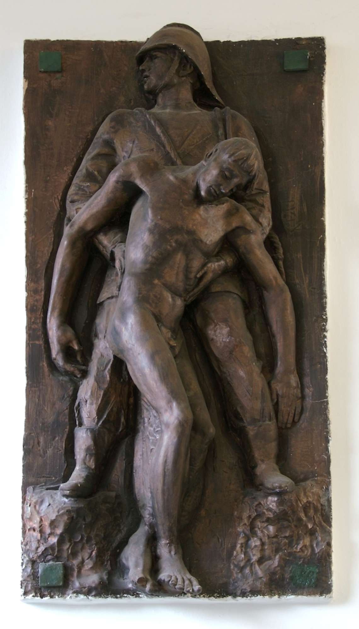 Gruppo che si compone di due figure di vigili del fuoco, in mezzo alle macerie. uno vestito in divisa solleva in alto il compagno completamente nudo. Il contrasto tra il vigile in divisa e il nudo del compagno, il dolore, il sentimento, il coraggio e l'altruismo, la vita e la morte, sono veramente gli elementi che illustrano il vero e sentito sacrificio (dalla relazione del bozzetto dell'autore Riccardo Rozzi)