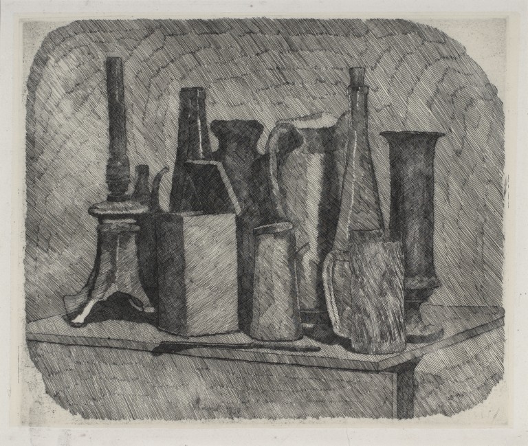 composizione di oggetti su un piano; spicca a sinistra la grande lampada a petrolio.