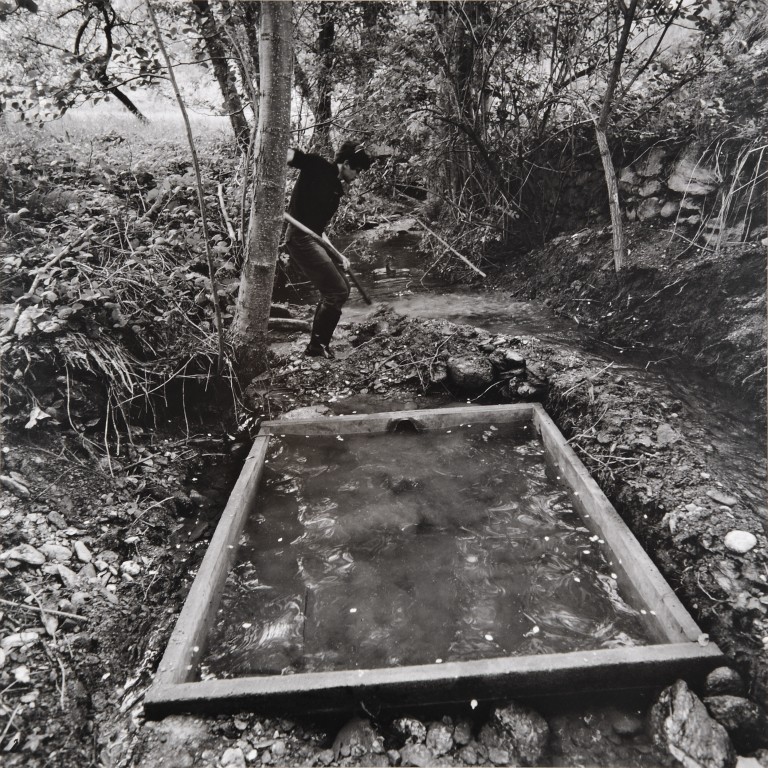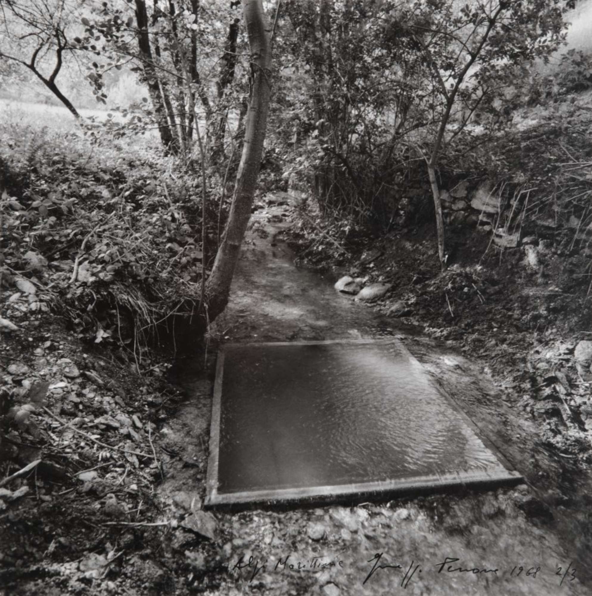 N° 5 foto in bianco e nero che documentano una performance dello stesso Penone nell'atto di intervenire su elementi naturali, quali un ruscello di un bosco, lasciando una traccia incancellabile che si trasformerà nel tempo.