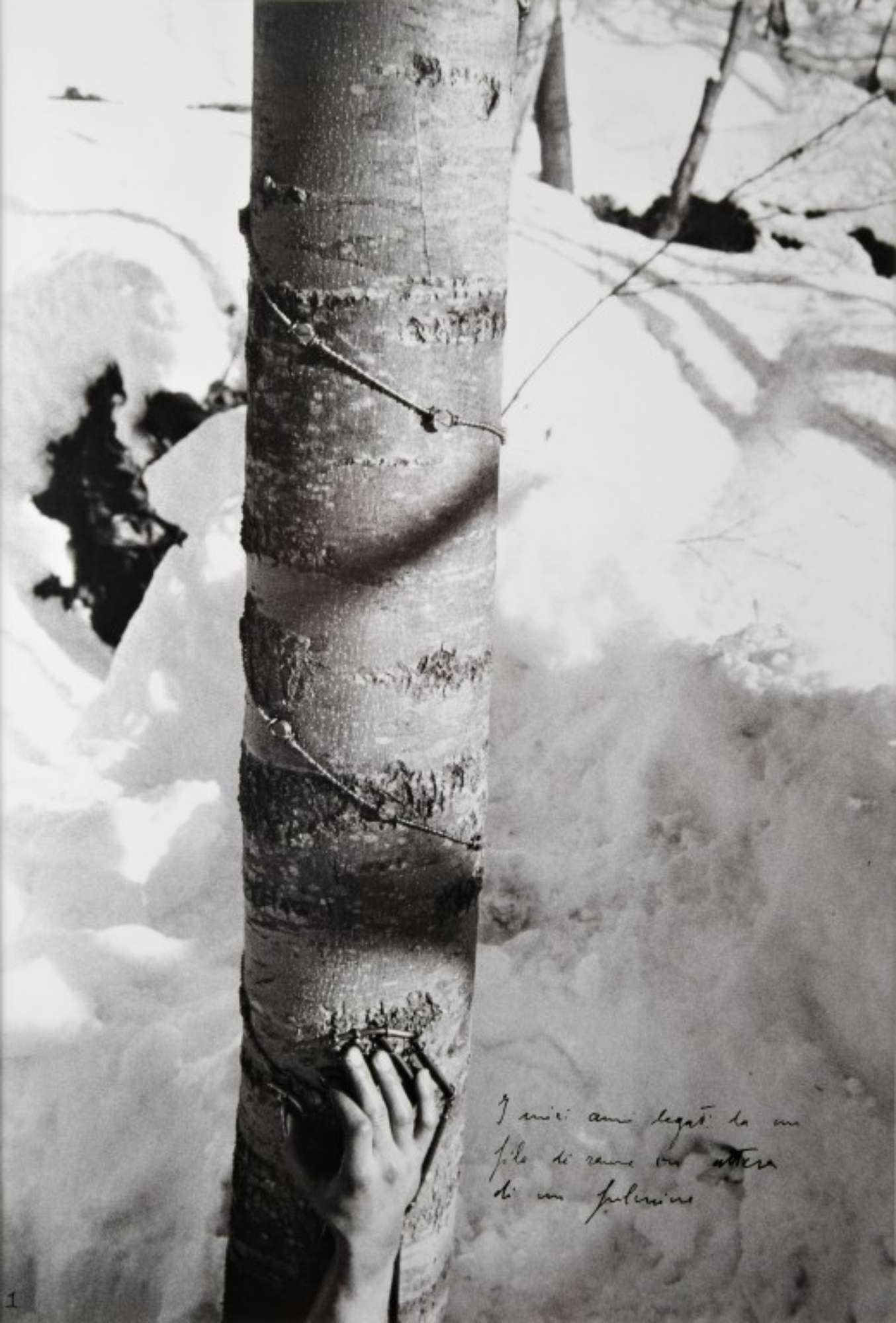 N° 2 foto in bianco e nero che documentano una performance dello stesso Penone nell'atto di intervenire su elementi naturali, quali gli alberi di un bosco, lasciando una traccia incancellabile che si trasformerà nel tempo.