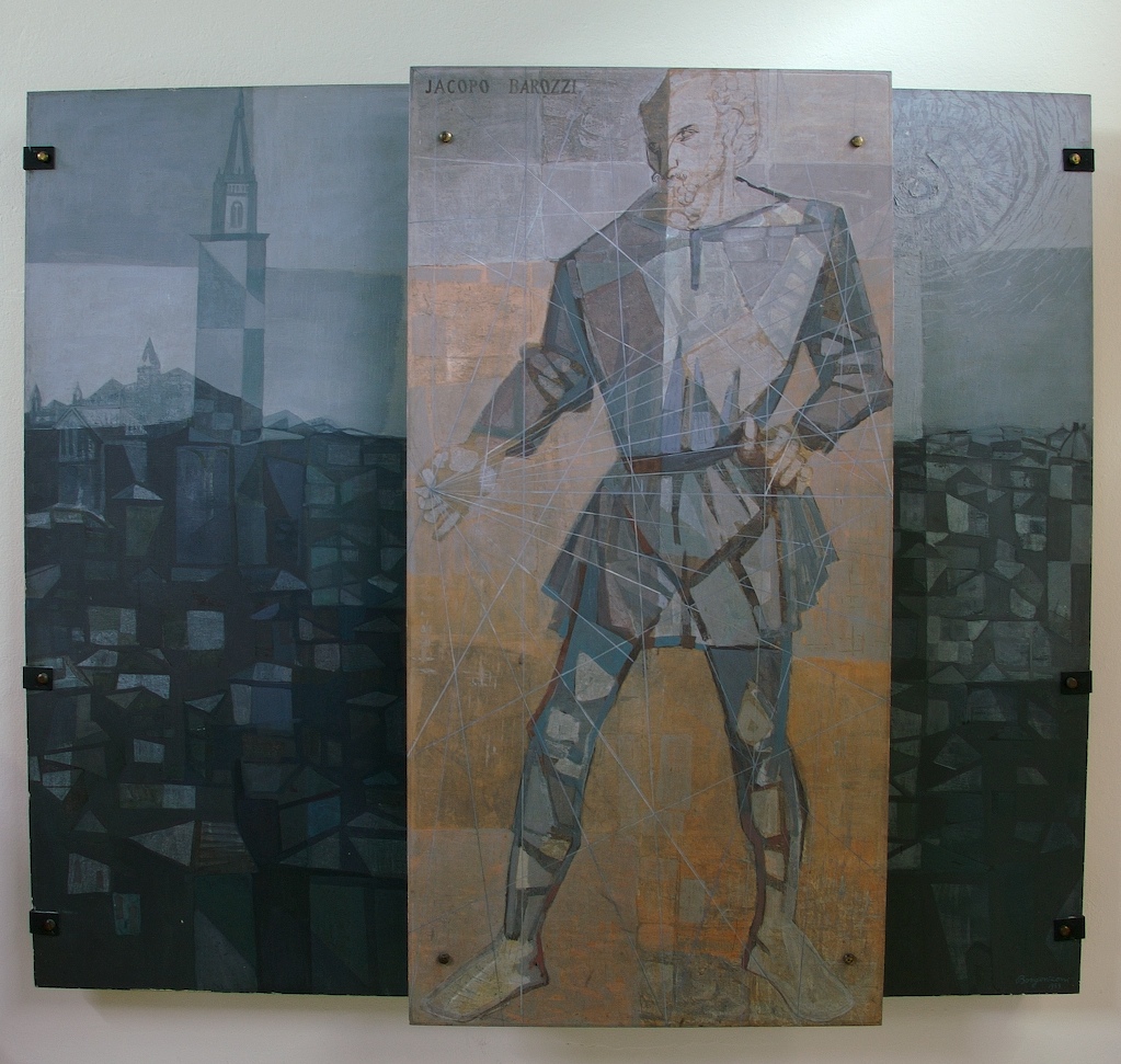 Aldo Borgonzoni, […], interpretava l’architetto e trattatista modenese dipingendolo sovrastante la sua città, su un doppio pannello in cui la poetica figurativa s’intreccia con il retaggio post cubista e un naturalismo espressionista, assai più evidente nei pannelli ad altorilievo dipinti da Borgonzoni ad encausto nelle Storie di Modena, conservate nella saletta adiacente e a cui si aggiunge un altro pannello con Scene scolastiche, vicino al neorealismo guttusiano, ma impaginato con uno squadernamento di matrice postimpressionista. (Collina C., 2009, p. 61)