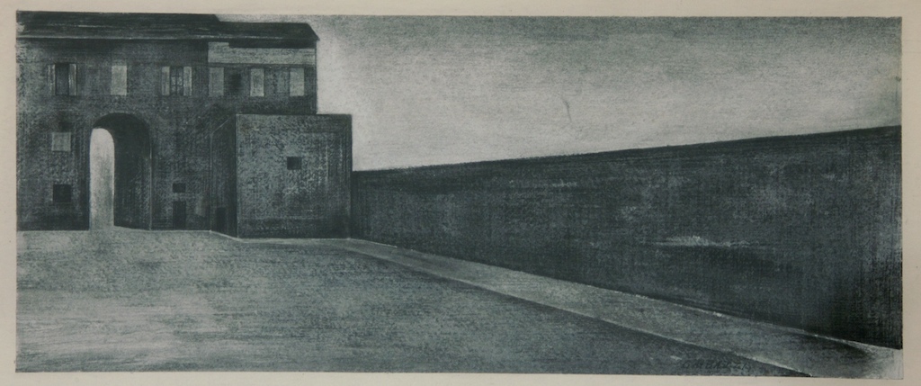 Gaibazzi amava la sua città di un amore forte e disperato [Parma…] i disegni di Gaibazzi colpiscono per l’assenza, assenza di paesaggio, assenza di personaggi, assenza di volti […] Più spesso è Sironi ad essere evocato come in quei disegni dove Gaibazzi riprende gli spazi costruiti con cupe geometrie, nella penombra, gli spazi delle periferie e quelli vuoti delle enormi piazze dei monumenti senza figure, senza attori […] Rosai, invece, credo sia la chiave per capire il disegno con il borgo, mentre le piazze metafisiche di de Chirico sono la chiave di lettura per un altro disegno. E poi ecco l’immagine dove nulla accade se non il contrasto violento fra la scritta “vini” e l’assurdo vuoto della piazza […] Gaibazzi scopre e ama gli autori che dentro le città e la loro storia hanno veduto un dramma, l’angoscia di un ossessione.