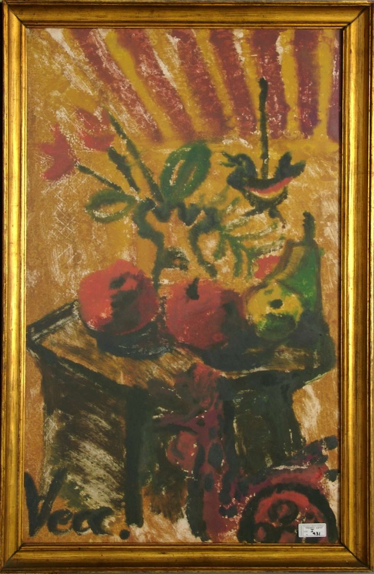 Natura morta all'interno di una stanza. In primo piano un cesto di frutta, mele e pere, e sullo sfondo un lampadario a guisa di uccellino.