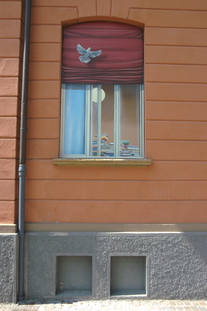 Gino Pellegrini, Colomba con libri, 2001, Biblioteca Comunale (Facciata anteriore)