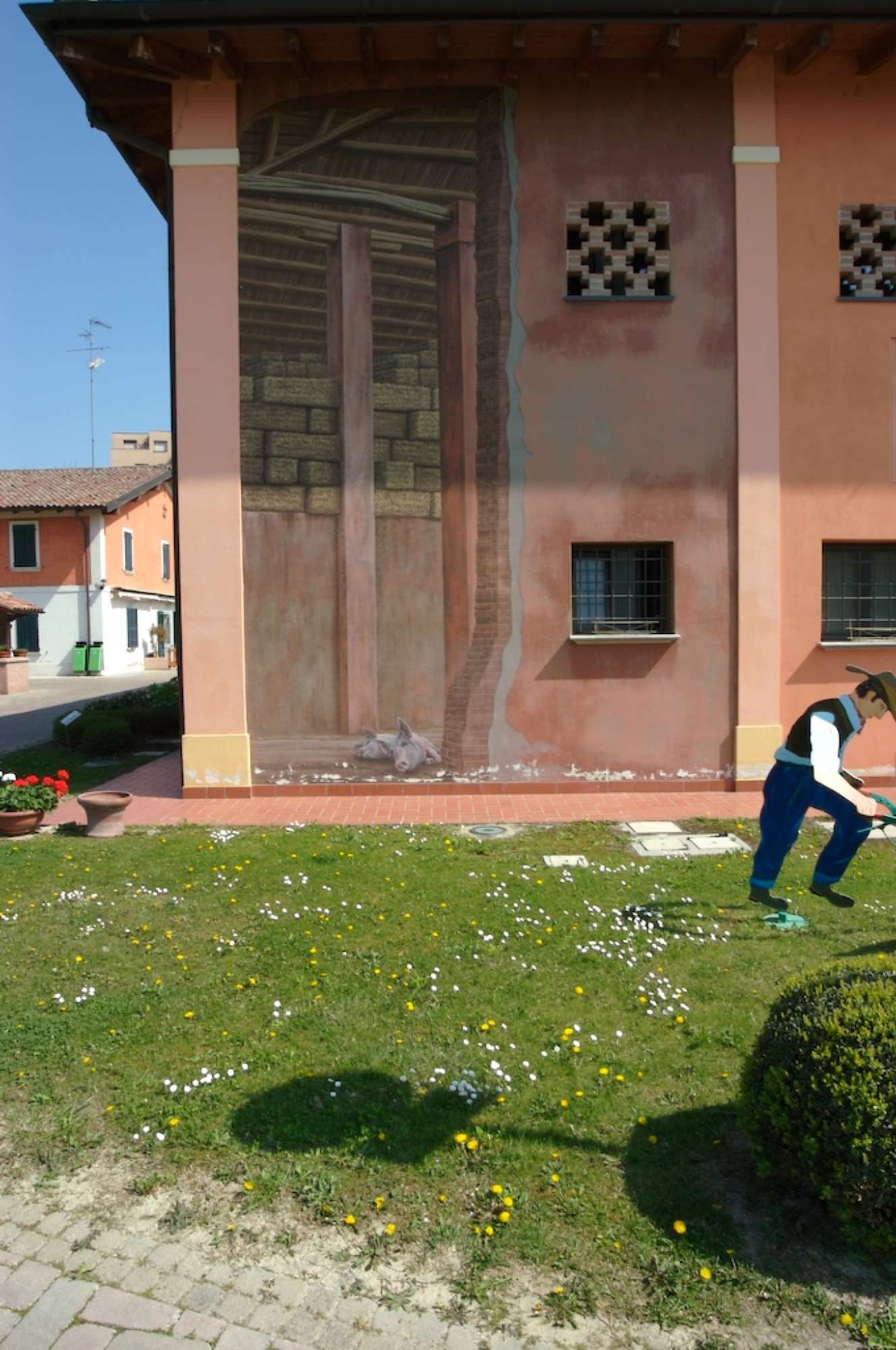 Trompe l’oleil fatto su testimonianze documentarie figurative dell’epoca: la stalla era aperta e si è voluta lasciare testimonianza del fienile com’era, tanto che il cane ritratto esisteva realmente.