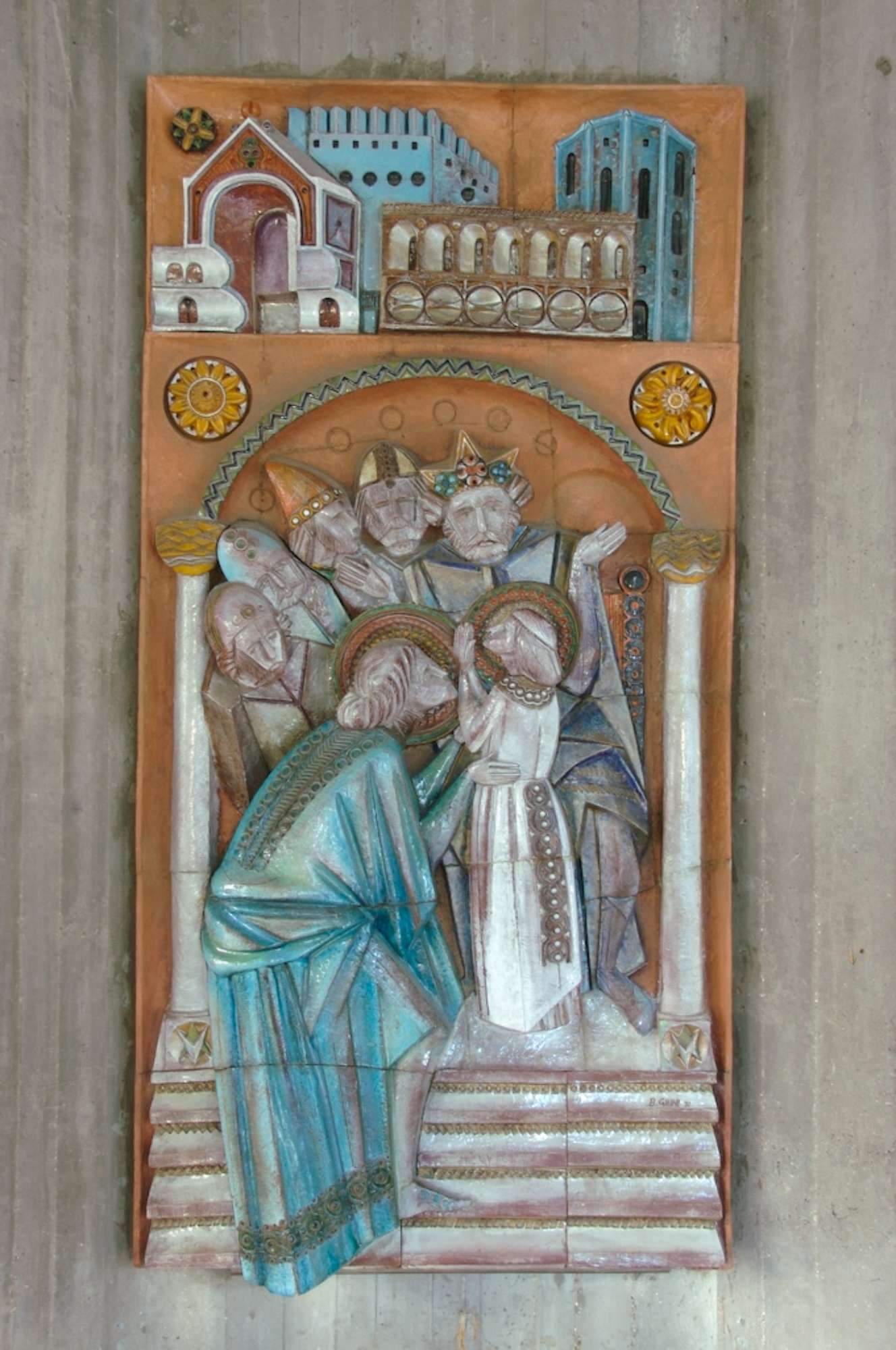Il bassorilievo in terracotta policroma viene eseguito in occasione del concorso bandito dall'Orfanotrofio Sant'Anna nel 1971 che prevedeva l'ideazione e l'esecuzione di un'opera destinata all'istituto stesso.