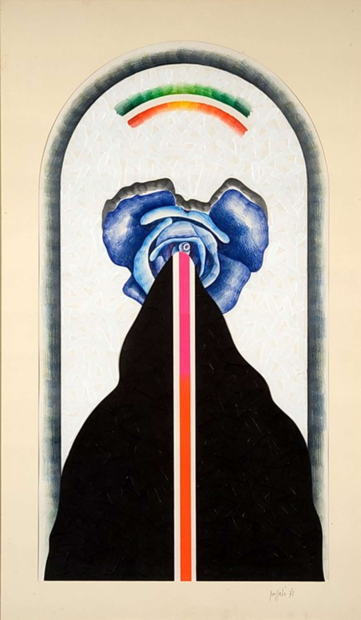 Una finestra ad arco a tutto sesto, tratteggiata in maniera astratta, inquadra una rosa blu raggiunta da una linea rossa.