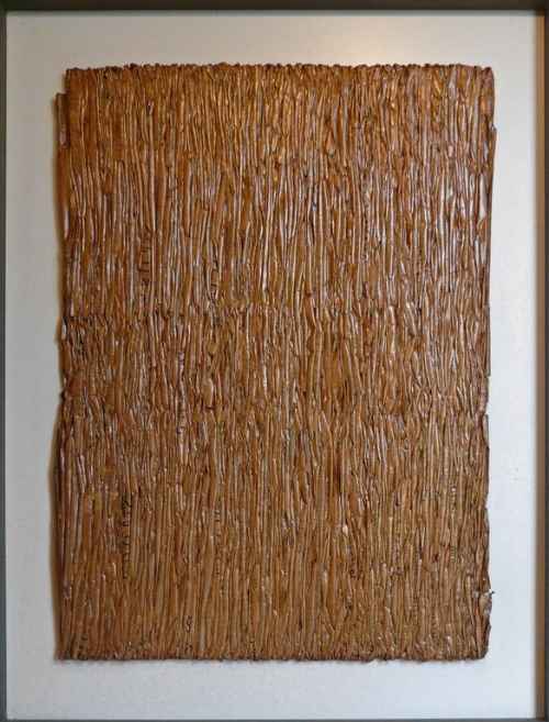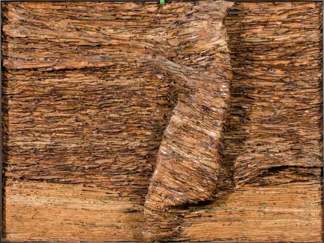 Radice di albero secca appesa come fosse un quadro sul lato di taglio del tronco. Lo sviluppo di crescita è prevalentemente orizzontale con un elevato numero di radici che dipartono dalla base del fusto.